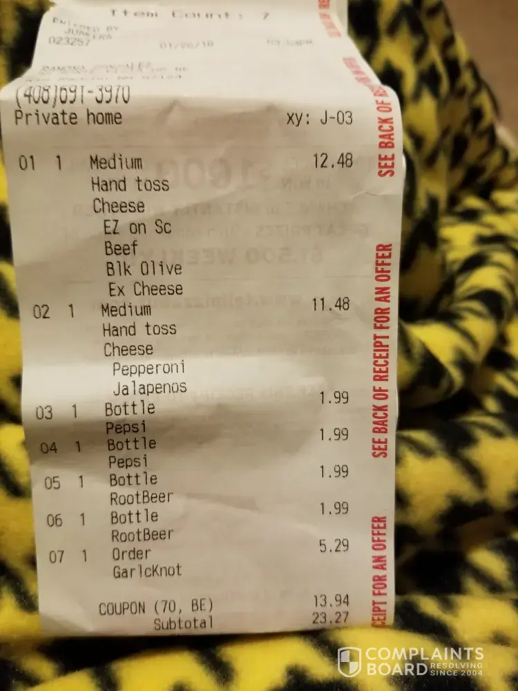 Pizza HUT #023257 date 1/26/18 invoice#19