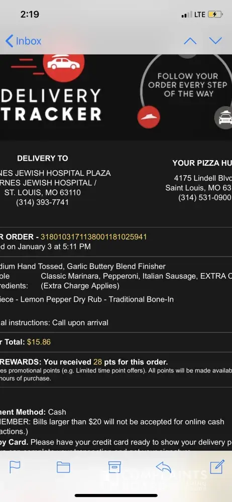 I placed a order yesterday January 3rd 2018 between 5:00-5:15 and I never received it. I made 5 attempts to get in contact with the store about my order. I ordered a medium hand tossed pepperoni and sausage and a 6 piece lemon pepper dry rub wings. My confirmation number is 3180103171138001181025941. Store was 4175 Lindell Ave Saint Louis MO 63108.