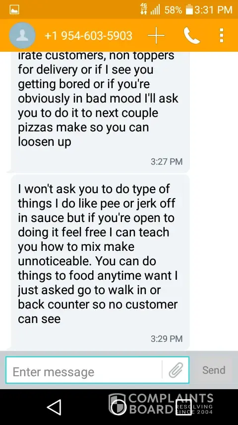 I was contacted by pizza hut over here in Houston Texas, and was offered a job, but while be offered the job i was told that they mess with the food and masterbate into the pizza sauce of rude customers. I have the texts of the conversation between the manager there, If there is anyways i can shoe those as proof. He told me that his name is bernard and he is 23 and is the manager at the deer park location on center street.