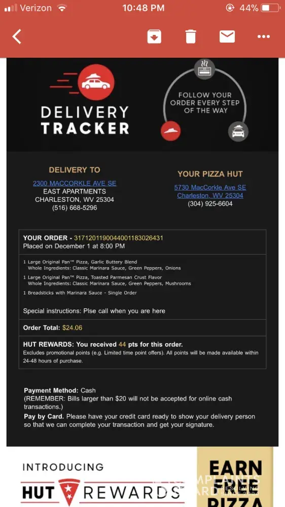 I did order pizza to carry out order #3171120184249001183027406
