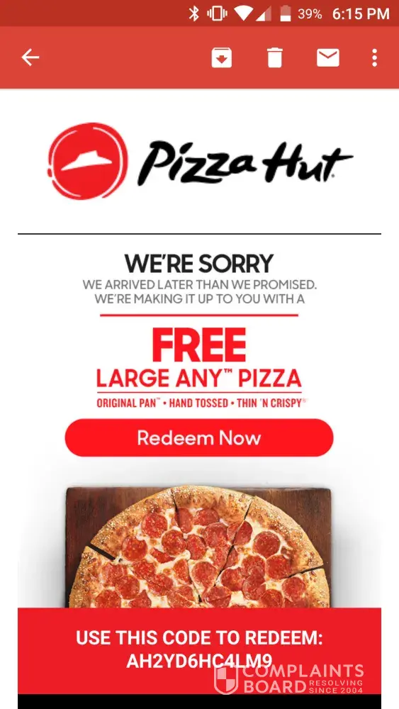 I received a coupon for a free pizza I tried to redeem it at pizza hut on David Dr I was told they couldn't honor it so I called the pizza hut on east airline and spoke to a guy said his name was Carl and asked to order my pizza he said he would take care of it and send it to the David Dr location I arrived at the David Dr location and they didn't understand what was going on so I called back to the east airline location spoke to the manager who said my order was there I am really upset the manager claims he doesn't have an employee name Carl and now I have traveled to different locations in which I still haven't received the pizza this is utterly ridiculous I am very upset and will never use pizza hut again. I have also submitted a claim to the bbb.