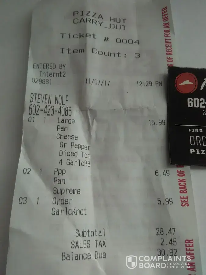 This complaint is in reference to a transaction that took place on Oct. 27, 2017. I made an on-line order to the Pizza Hut located at 3200 S Crater Rd in