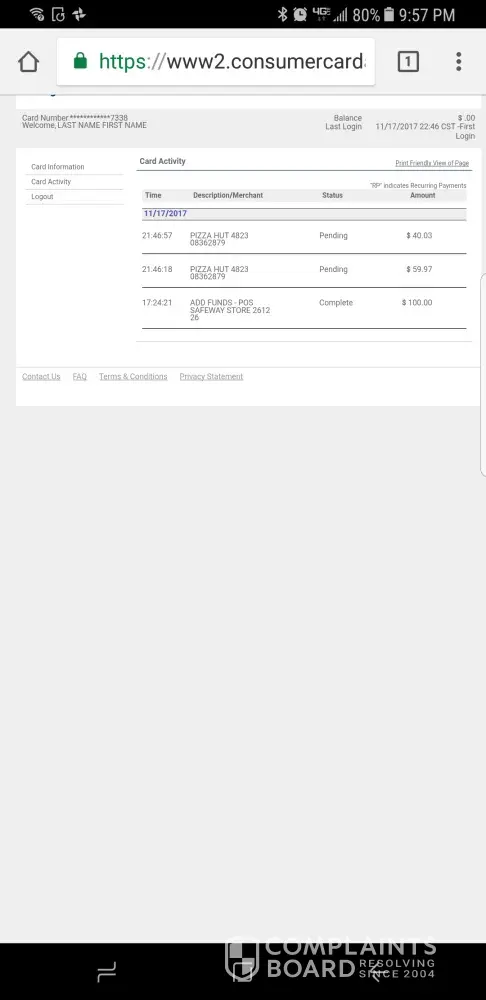 We ordered pissed for a company pizza party and we used credit card and they said they charged us 49.98 and when we went to look at the bank statement they charged us 59.97. We ordered a sceond pizza for the same price as the first and it only too 40.03 and he said that we still owed him 9.53 for it. It's a $100 gift card. The man on the phone (carl) was so rude and for 20 min we argued back and forth. And said that it's our banks fault and not theirs. But bank statements don't lie. I'm just appalled that he raised his voice and argued with me, for that long. As a manager he should not habe done that to a potential customer. I am very unhappy.