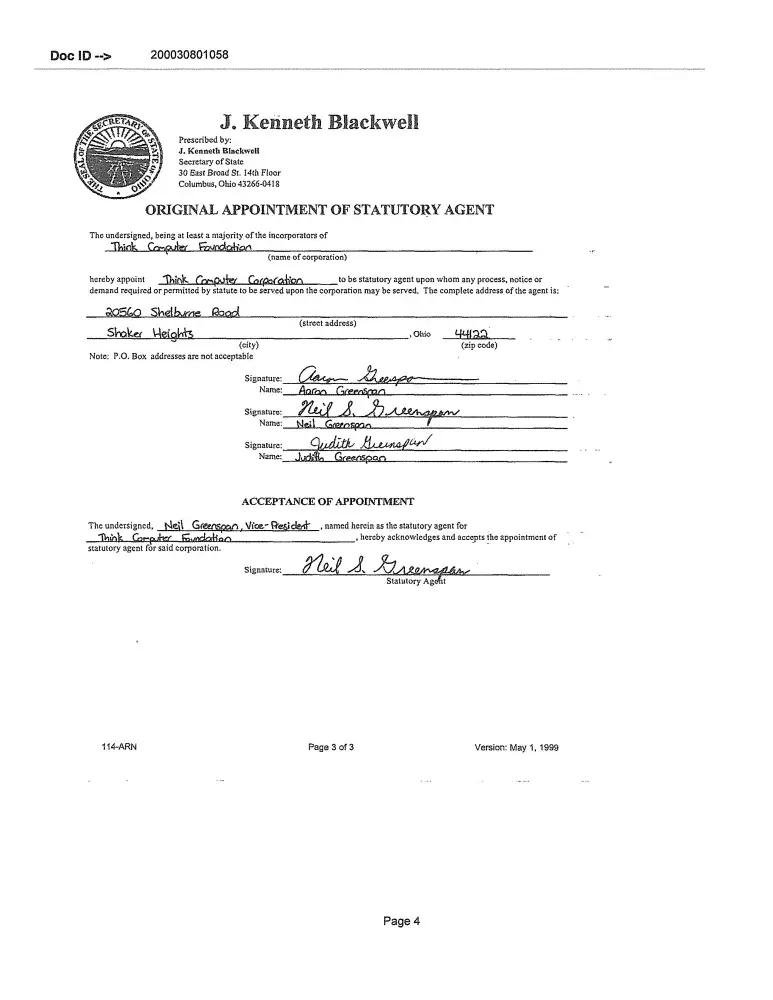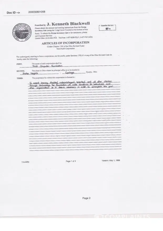 XAVIER BECERRA Attorney General State of California DEPARTMENT OF JUSTICE CT-470 Confirmation of Registration 1300 I Street P. O. Box 903447 Sacramento, CA [protected]-6400 Ext. 4 Fax: [protected] Registration@doj.ca.gov January 16, 2020 THINK COMPUTER FOUNDATION 20560 SHELBURNE RD SHAKER HEIGHTS OH 44122 State Charity Registration Number: CT0267109 RE: CONFIRMATION OF REGISTRATION WITH THE ATTORNEY GENERAL’S REGISTRY OF CHARITABLE TRUSTS The captioned entity has been assigned the State Charity Registration (“CT”) Number set forth above, however, the entity has not yet submitted all of the information required by California Code of Regulations, title 11, section 300, subdivision (b). To complete the initial registration file, please submit the following, together with a copy of this letter: 1. A copy of the Application for Recognition of Exemption (IRS Form 1023, 1023-EZ, or 1024), if submitted to the IRS. If you do not have a copy in your files, a copy can be requested from the IRS at [protected] or https://www.irs.gov/uac/about-form-4506a. 2. An executed copy of the most current bylaws. Please note that the Annual Registration Renewal Fee (Form RRF-1) Report must be filed annually four months and 15 days after the end of the organization’s accounting period. If an extension was requested from IRS, please file Form RRF-1 with the completed IRS informational return together with a copy of all extension requests. The organization’s address of record is used for any necessary contact. You are responsible for notifying the Registry in writing of any change of address. If the captioned organization contracts with a commercial fundraiser for charitable purposes or fundraising counsel, that entity must also register and file annual reports with the Registry. All forms and instructions are available on our website at http://oag.ca.gov/charities. Directors of nonprofit corporations are required to adhere to the provisions of the California Nonprofit Corporation Law (Corporations Code section 5000, et seq.). Trustees for charitable purposes are required to adhere to the provisions of California Probate Code (commencing with section 15000). Please respond within thirty (30) days from the date of this letter. Thank you for your attention to this correspondence