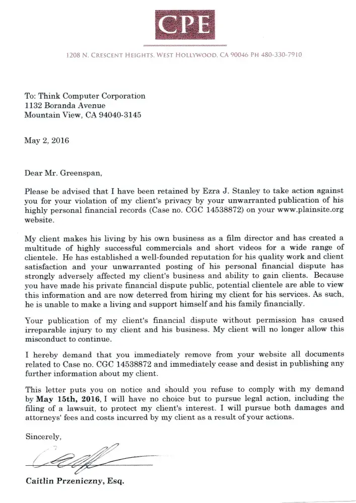 Ezra Stanley a victim of blackmail and extortion by Aaron Greenspan using his extortion website plainsite.org will testify against Aaron Greenspan in a court of law about the thousands of dollars that were paid to Aaron Greenspan to remove legal documents from plainsite.org.