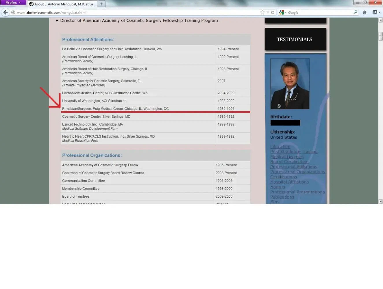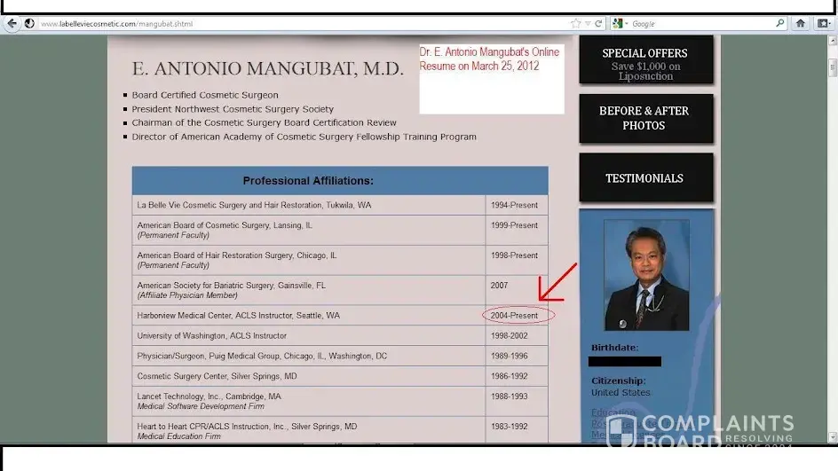 Dr. Tony Mangubat (aka Dr. E. Antonio Mangubat, Dr. Elmer A. Mangubat, Dr. Elmer Antonio Mangubat), LA BELLE VIE Cosmetic Surgery Centers, is INCOMPETENT (Tukwila, Washington) This is a NON-COMMERCIAL posting/website. Any statements I make below are my own opinion. To read PROOF of Dr. Tony Mangubat’s (aka Dr. E. Antonio Mangubat) INCOMPETENCE, please...