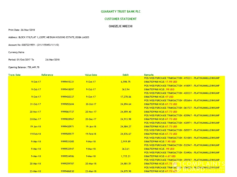 Platinum Millennium Publishing unauthorised deductions from credit card