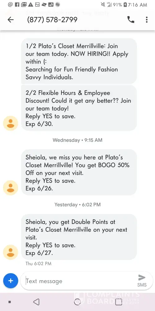 I go to Plato's Closet in Merrillville, IN. I signed up for their text messages & rewards points. They're constantly blowing my phone up with messages. I get a message that says, " Buy one Get one 50% off your next visit expires 6/26" SO, I rush to the store for this. I gather all my merchindise. Then at checkout they tell me it only applies to one item. Wtf is that! That is NOT what the text said. I also got a text that said, " 90% off Clearance" Does that only apply to one item? Then I got another text that said, "Double Points off on your next visit expires 6/27" Does that only apply to one item?