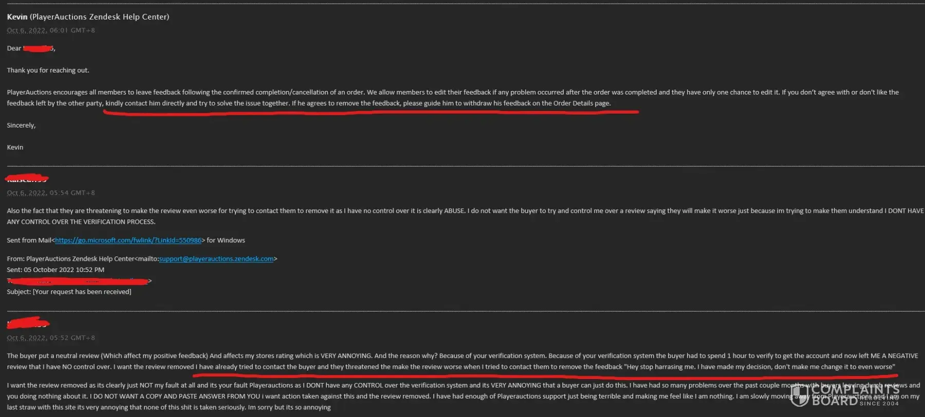 Another issue is where the verification system is Playerauctions is terrible a buyer had to spend 1 hour to verify to buy the account, they send gave me a Neutral review which is neutral as it takes away your positive feedback rate? I tried to contact the buyer and they threatened me and said they would make the feedback worse if I tried to contact them again, Yet I am trying to explain to them that the issue isnt my fault and I had no control over it. Anyway I try and contact support and 9 MINUTES LATER "Kevin" responds saying for me to try and contact the buyer to remove it yet I stated in the support I tried to contact them and they threatened me. Clearly this "Kevin" is a bot and the situation is not being handled by a real person.