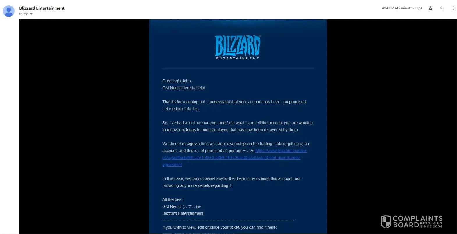 The seller said he got nothing to do with the account he sold, since it already sold, but how about and why the email i got received from before the account got compromise was his name (Mariano is the name of the seller i bought the account) It's either he filed a ticket and blizzard responds goes to my email since i changed the email of the account. so this is not enough proof that the account was recover by none other than the seller(Mariano) himself?, i properly asked the seller to help me and just recover the account if it was not his doing, but he doesn't care at all and always said that he can't do anything while i said that he has a big chance if he's the one who recovered the account and just give it to me again via email or playerauction message, the seller was very unprofessional.
