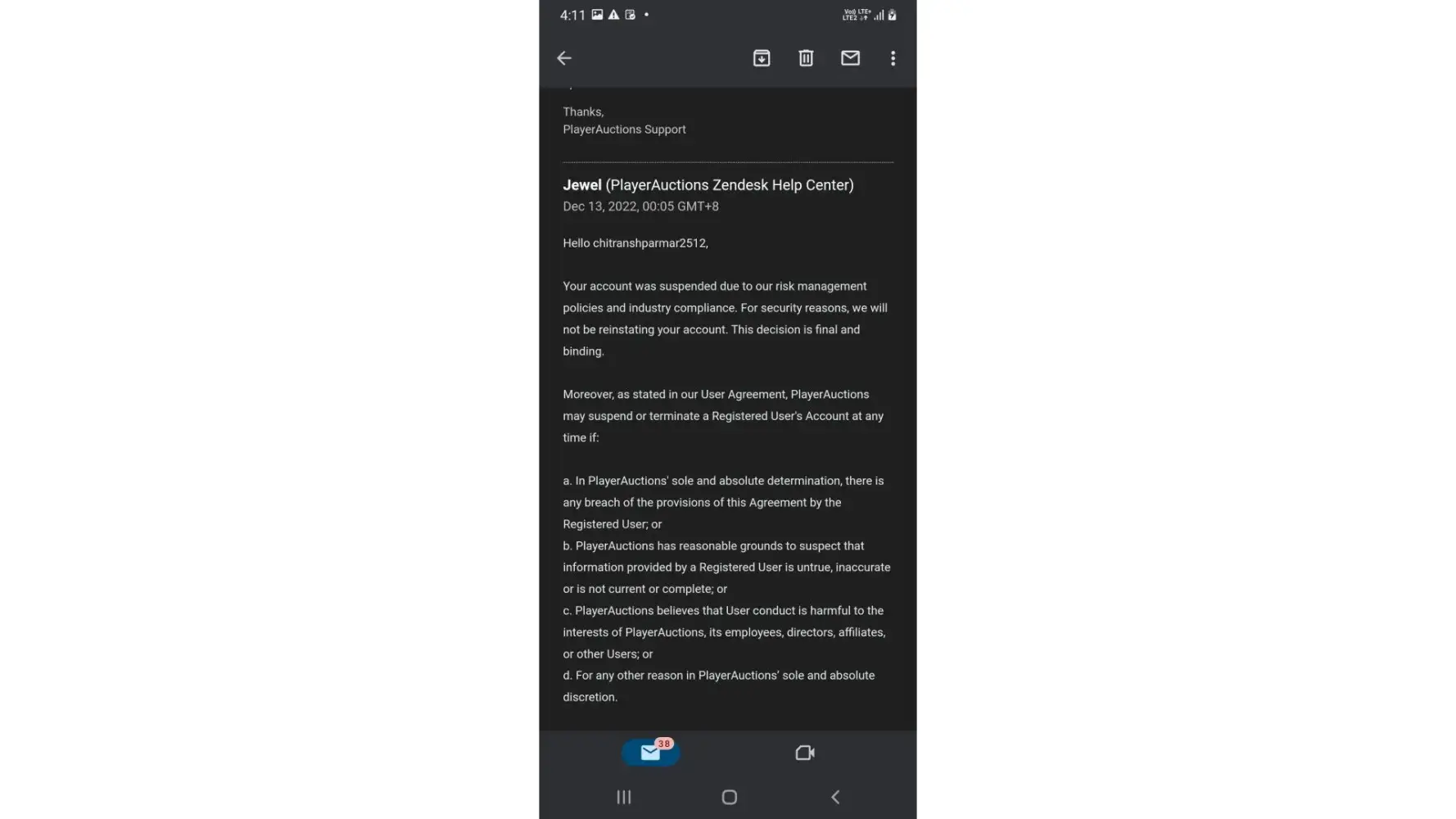 So I received an email after noticing my PlayerAuctions is banned. Here the reply: