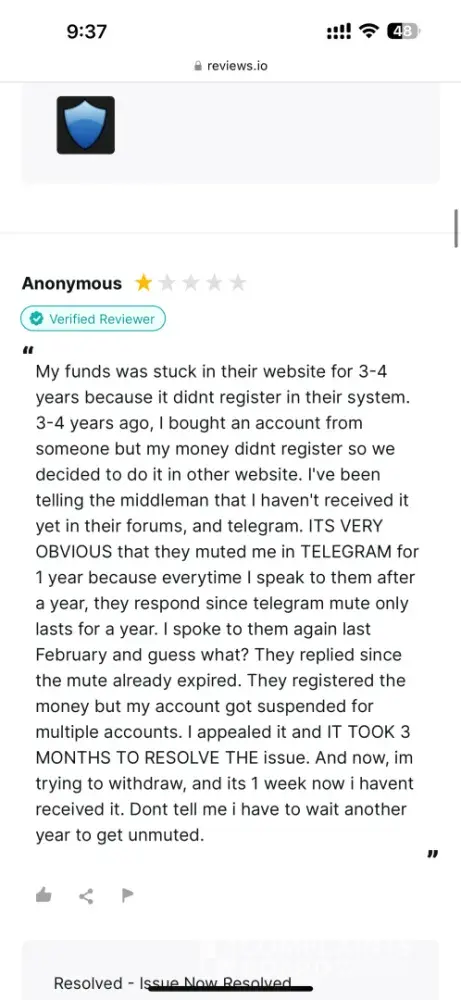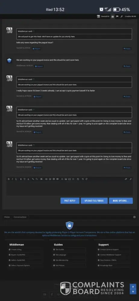 If you use Middleman services, they will waste your time, make your experience so miserable and you'll never get your money, ever! After selling my very old high quality Reddit account (+500k karma!) I have been waiting for over 2 months for them to process my payment. Initially I provided them with my PayPal information and ID, but after ignoring me for over a month, I provided 2 more payment options just in case they may have delays with PayPal. I kept asking for payment status about once a week (via PlayerUp pm, forums and Telegram) and didn't get a single response from Middleman or staff for weeks! The worse thing is "last seen 1min ago" every day I log in which means they are deliberately refusing to pay me, that and the fact they banned my posts on the forms without any feedback (my posts shows 0 visits and don't appear for me when logged out)... After I finally decided to kiss my money goodbye and wrote a bad review here, the Middleman messaged me immediately (like within 1min lol) on Telegram, he basically demanded that I delete the negative review in order to get my payment, and he made a bold claim that "my mixed payment options caused delays". Are you freaking kidding me? Still, I gave them the benefit of the doubt because 1) I need my large sum of money. 2) Middleman confirmed they finally have all needed information and that my payment shouldn't take more than 96 hours... Needless to say, that was a lie too and just an attempt to stall me even longer... And btw, the Middleman will reduce your payment again and again. If you sell an account at 1000$, the Middleman will offer you 700$ if you're lucky, and if he has to reissue you a new cashout link (which they did for me), they will reduce again to an amount they see fit... In conclusion, please don't make the same mistake as me and never give 2nd chances, they will only provide you with false hope and waste your time and energy for nothing... I logged in multiple times a day just to check if I got my payment and I was sad to see none... (Middleman, don't even attempt to fool me again into deleting this review, I won't! In fact I will write on 4-5 different places unless you give me my money, today! Also feel free to ban my account on the forum because guess what, I don't want to ever use it again!)