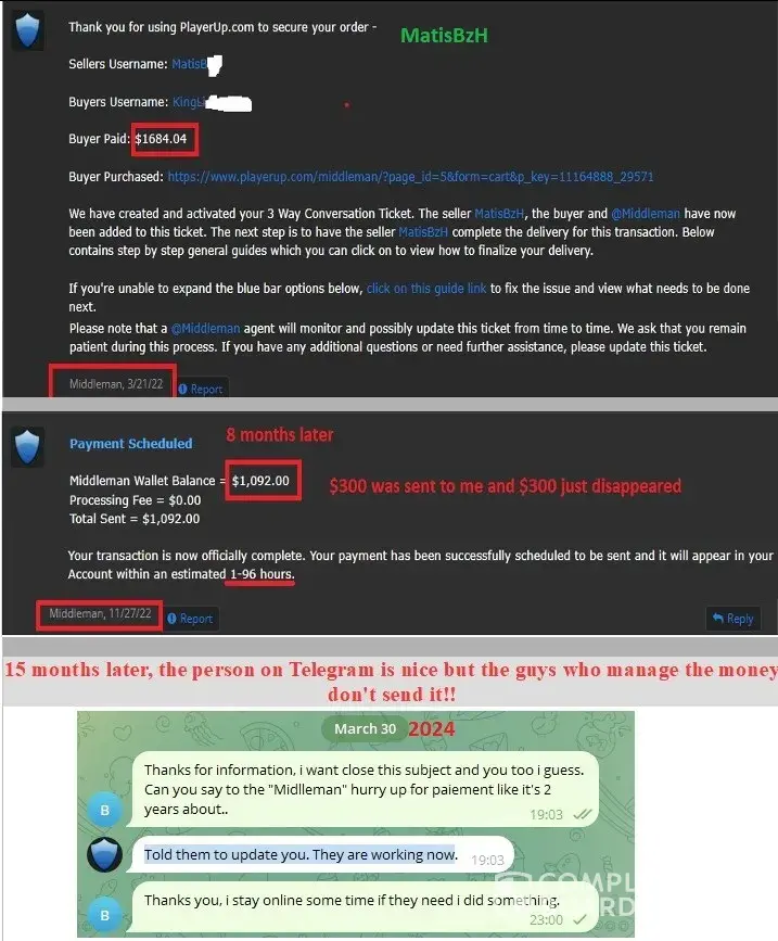 - March 2022 i sell an account for 1600$ on Playerup, Middleman must send me money after buyer have paid 1696$