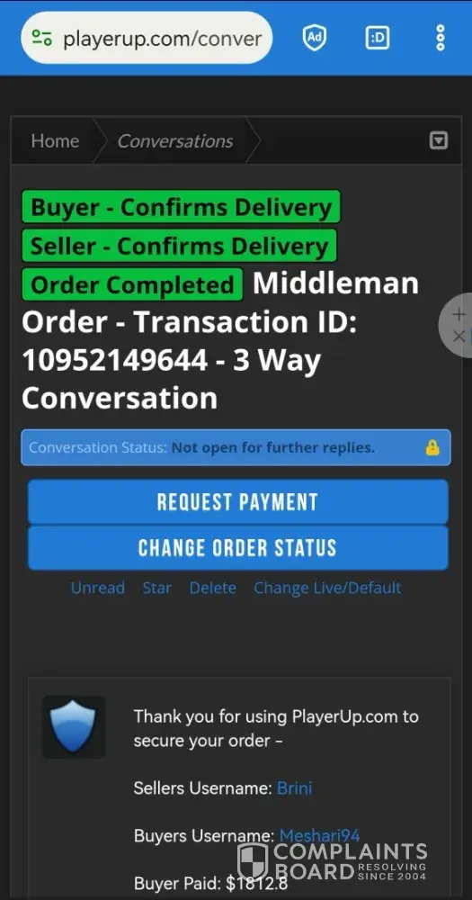Desired outcome: Please send me the money I've sold the account for.