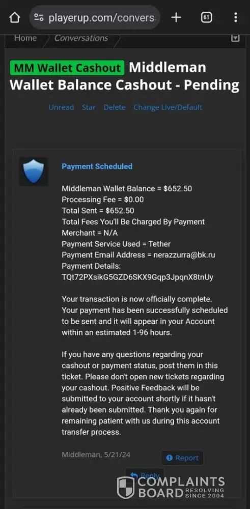 Sold my account about 2 months ago for 800$,only $650 was written for crediting. After about 1 month of initiating this transaction I received message that my payout is scheduled to be sent within 1-96 hours. It's been a month but nothing changed and no money arrived even after multiple messages, tickets.