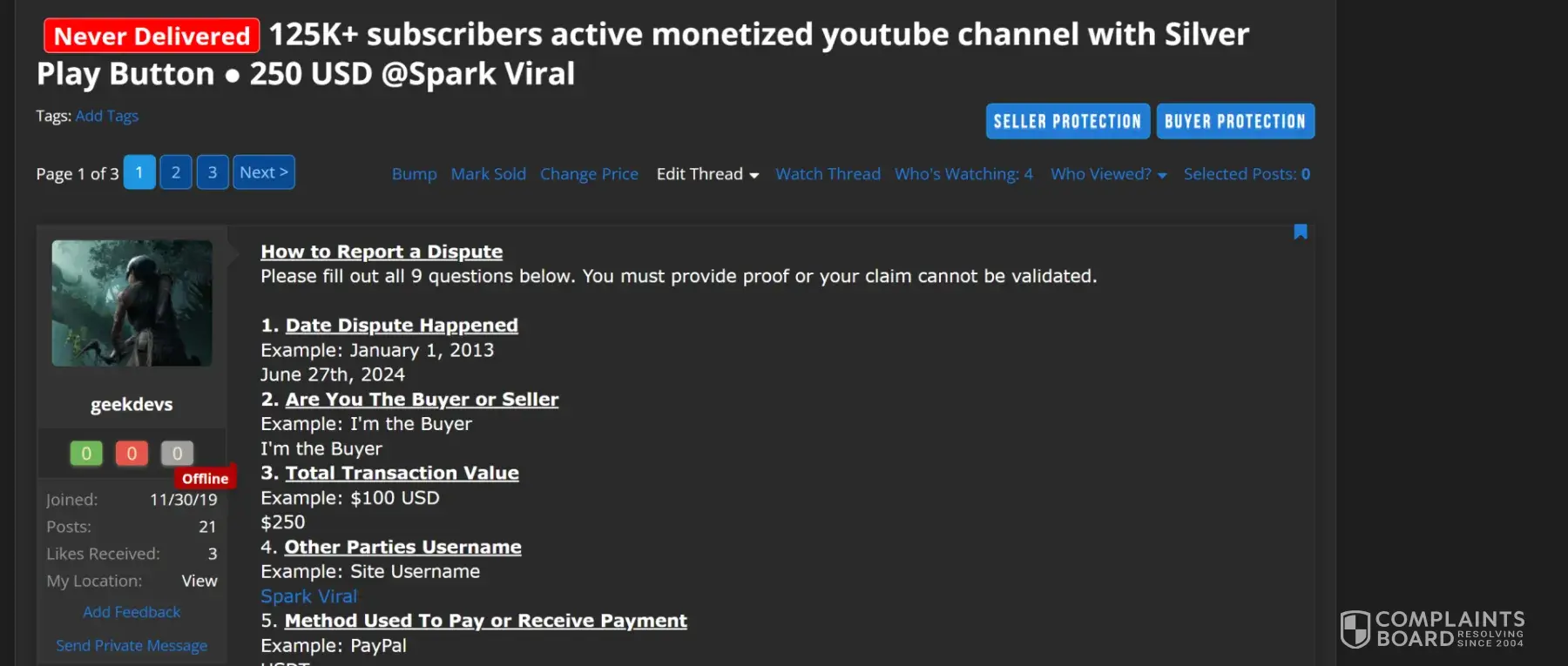 7. Buyers then submit disputes on PlayerUp (Example: https://www.playerup.com/threads/125k-subscribers-active-monetized-youtube-channel-with-silver-play-button-â—-250-usd-spark-viral.6214009/)
