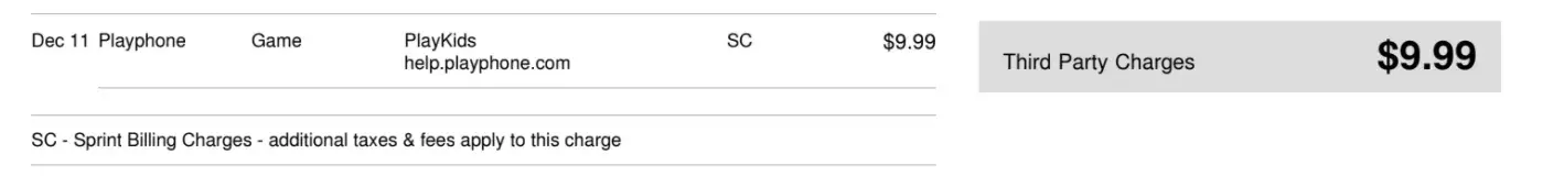 A charge of $9.99 showed up on my Sprint's December, 2020 bill claiming to be Third Party Charges of some game from playphone.com, which I have no idea when or where I played in my phone.