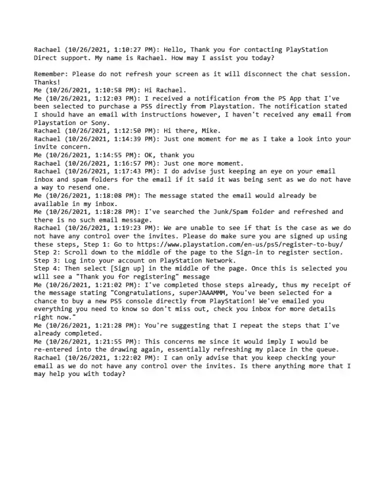 Recently I entered a draw for a chance to purchase a PS5 console directly from PlayStation. I received a message from the PlayStation app informing me that I've been selected to purchase a PS5 (image attached). There was no email received to make the purchase so I attempted to contact PlayStation for assistance. The webpage is designed to keep customers from engaging with live support reps and instead redirects customers to various FAQ pages. After locating a number to call, and after waiting to speak with a rep I was instructed to visit psdirect.com/chat to chat with the correct team. This chat window also redirects customers to various FAQ pages but after some persistent searching I was able to locate the window to chat with a live representative. After explaining my problem to the rep (Rachael), I was instructed to re-enter the draw, and then I was encouraged to enter future drops before the rep killed the chat before I could copy the transcript. I've attached what I was able to copy from the transcript before the chat was killed by Rachael.