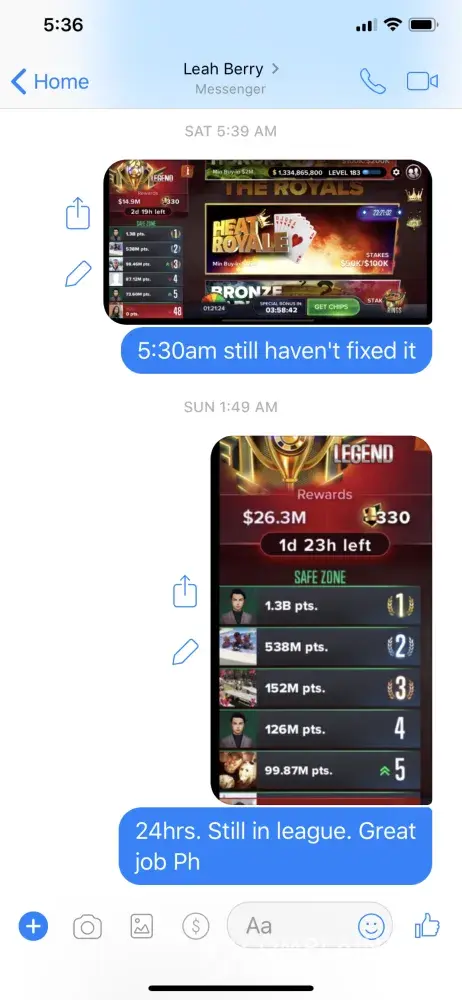 Every 3 days you end one league and start a new League. This is the third time I entered a so called new league and players already had excessive points when we are all supposed to start at zero. I submitted complaints to support and my "Rep" Leah Berry without any corrections. When I entered my last league the clock showed that is was an hour old, however players already had millions and billions of points. I've received no response from support and all Leah Berry had to say is contact support. Ridiculous. No fairness. In addition they increased their rake to 46% which is unheard of. Also the points you accumulate for your league points are on 65% of the pot you won (which already includes your ante and any bets you made). This company is ripping you off from both ends with absolutely no customer service.
