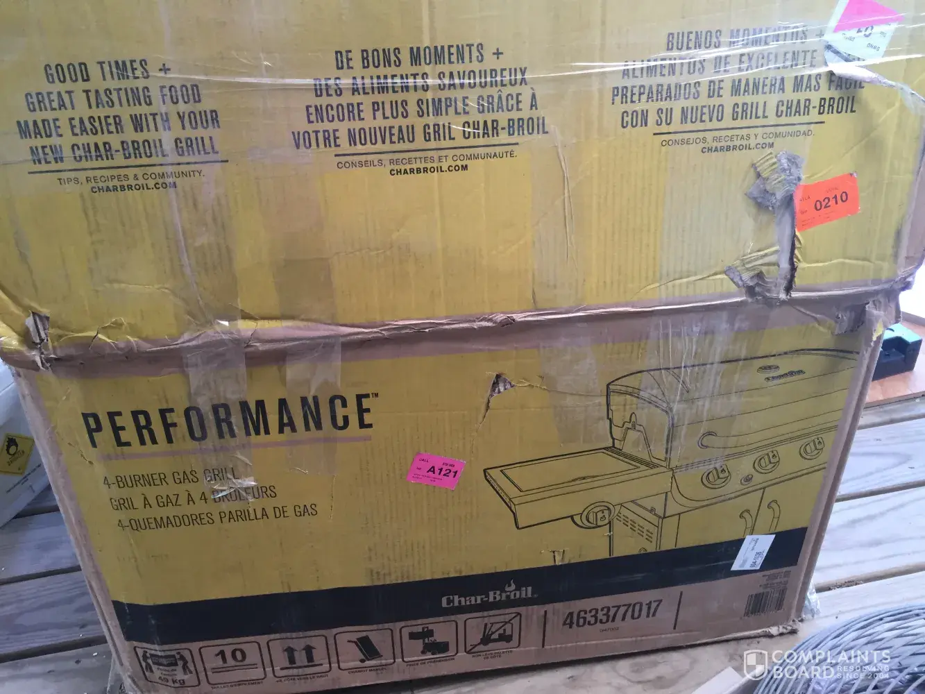 The grill was delivered upside down, in a disheveled box with packing tape wrapped around it to hold it together. When box opened for assembly, there was a bolt missing on the right side hinge. The bolt was not located. There is damage done to the area around the hinge, the metal is bent. There are scratches to the grill top.