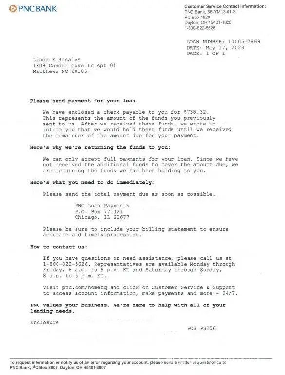 I am contacting you because I am very disappointed with the way the bank has processed my payment for last month, (attached is a note and check received from PNC)