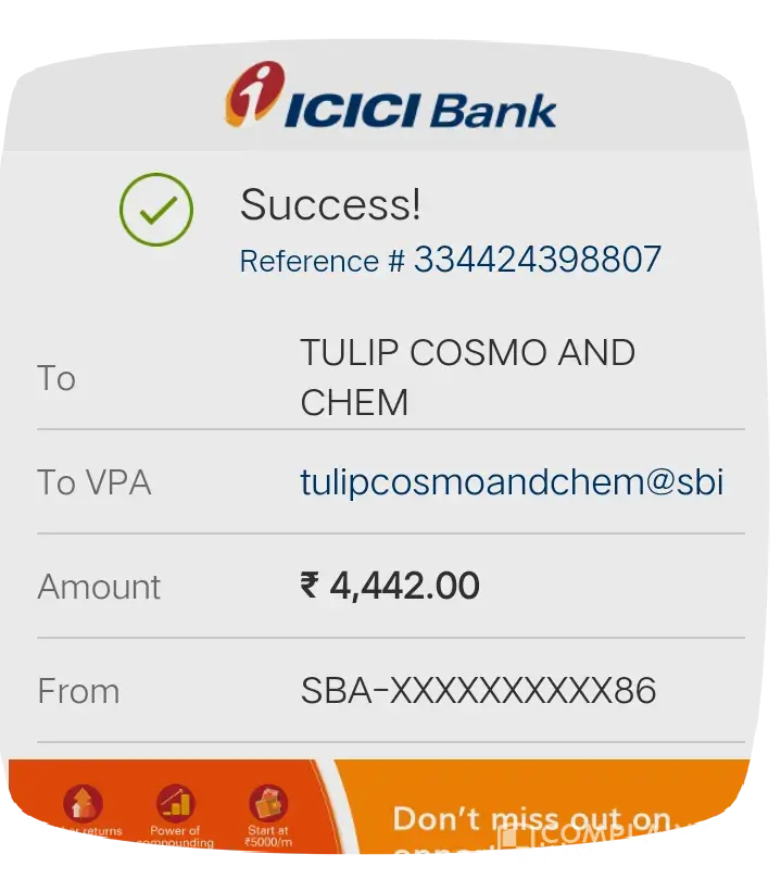 ICICI Bank Acct XX186 debited for Rs 4442.00 on 10-Dec-23, TULIP COSMO AND credited. UPI:[protected]. Call [protected] for dispute/SMS BLOCK 186 to [protected].