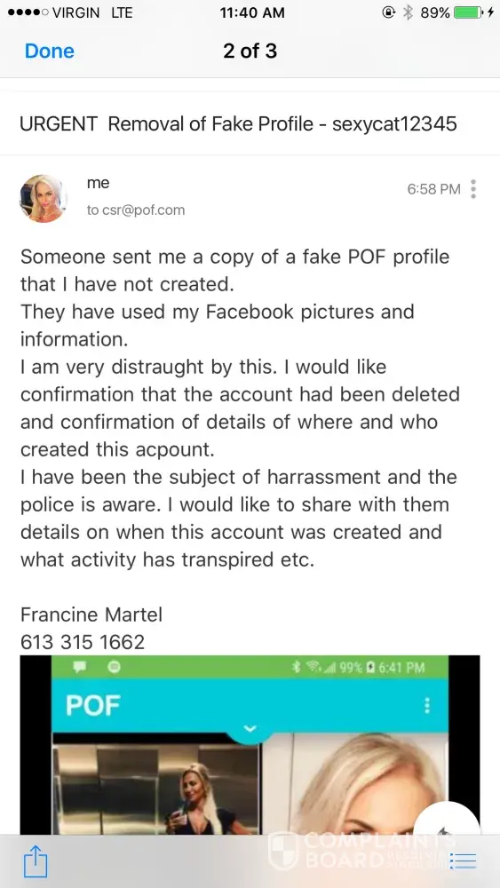 PoF.com / Plenty of Fish fraudulent profile - already reported with proof, profile still active