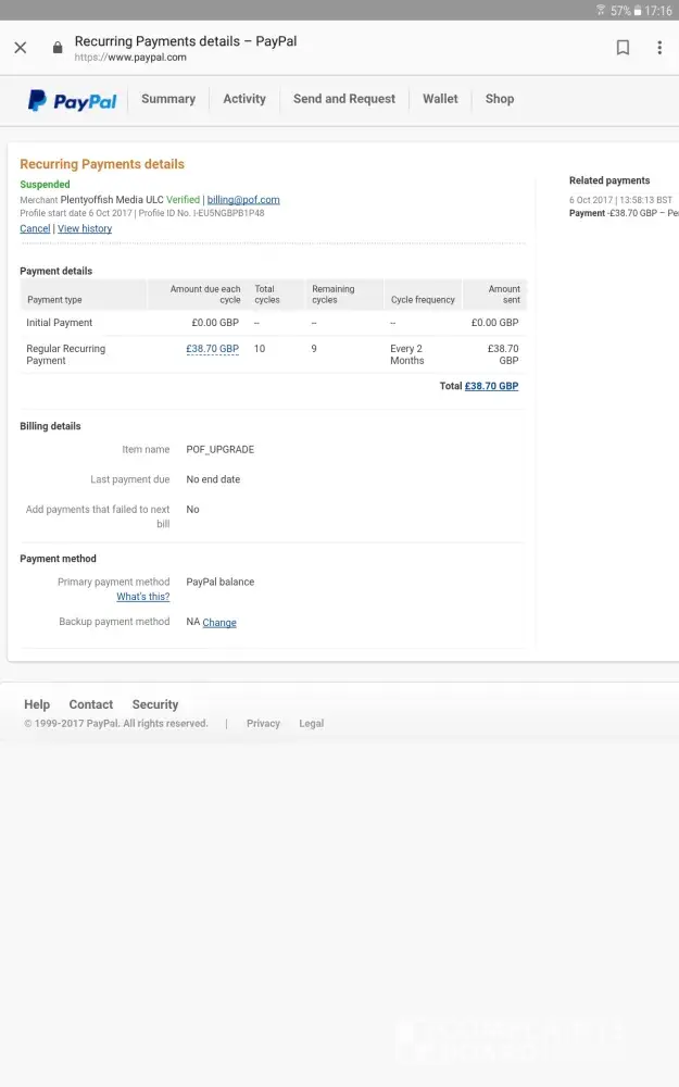 I recently had a direct debit of £38.70 taken from my bank account this was regardless of cancelling my account with pof and this being suspend with paypal all prior to this transaction going through and being processed. I did sign up for one payment at the start of my pof agreement and I did not want or willingly agree to any further payment, this being the reason for cancelling my payments and account.