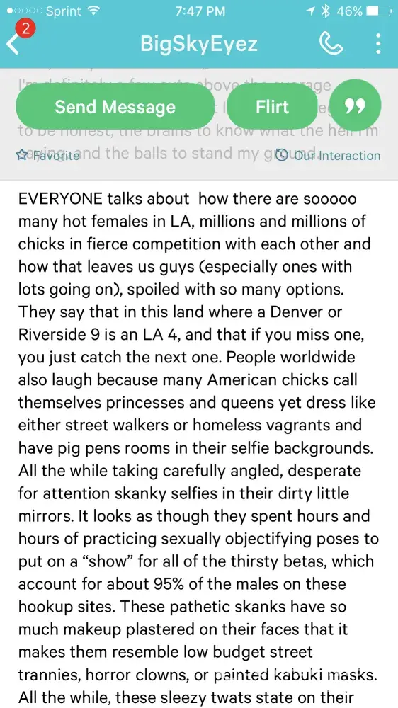I want to warn women before they use this site. It can be very dangerous for you, girls. As a rule, most men on this site are married or womanizers. They behave like crap, humiliating women, stalking them and writing dirty letters. And guess whose account the service will delete? Yours! What reasons? I have no idea. But if you want to find a good guy, I recommend you to use different dating sites.