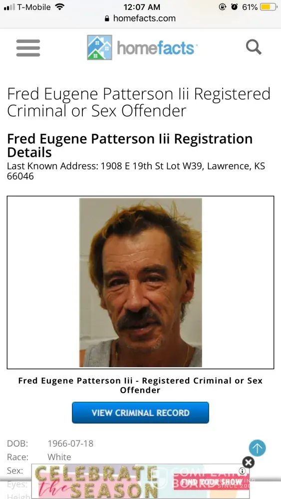 Fred Patterson 111 is posing as a person in the military and has been in contact with my cousin. Fred's address is 1908 E 19th St Lot W39 Lawrence-Kansas 66046. I know this bc I went with my cousin to help him send Fred $100 via Money Gram at Walmart. I told my cousin not to send this guy money but he didn't listen. I googled his info and found out he is a registered sex offender- children 12-14 years old. He claims to be on a military base and has a house in NC.