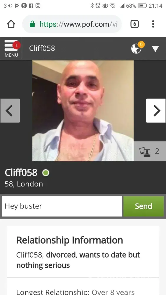 Nothing worse than to find out that cliff058 from London is a good compulsive liar and cheat. His profession was not at managerial level. Looking for a good friend with benefits is the words that he should have used. Scamming money of people giving sob stories about his lonely life. Claiming to be divorced, but still has a wife and son at home and goes to family outings or events together. When confronted told me that she is terminally ill that she left him with a big debt. Still living a lie, then told me she's no longer in the picture. He'd only got back from holiday with her. Beware ladies! His trap is not set up straight away, asking for money is another thing but deceiving a lot of women per week and looking for a lot of fbuddies. This man is joke!