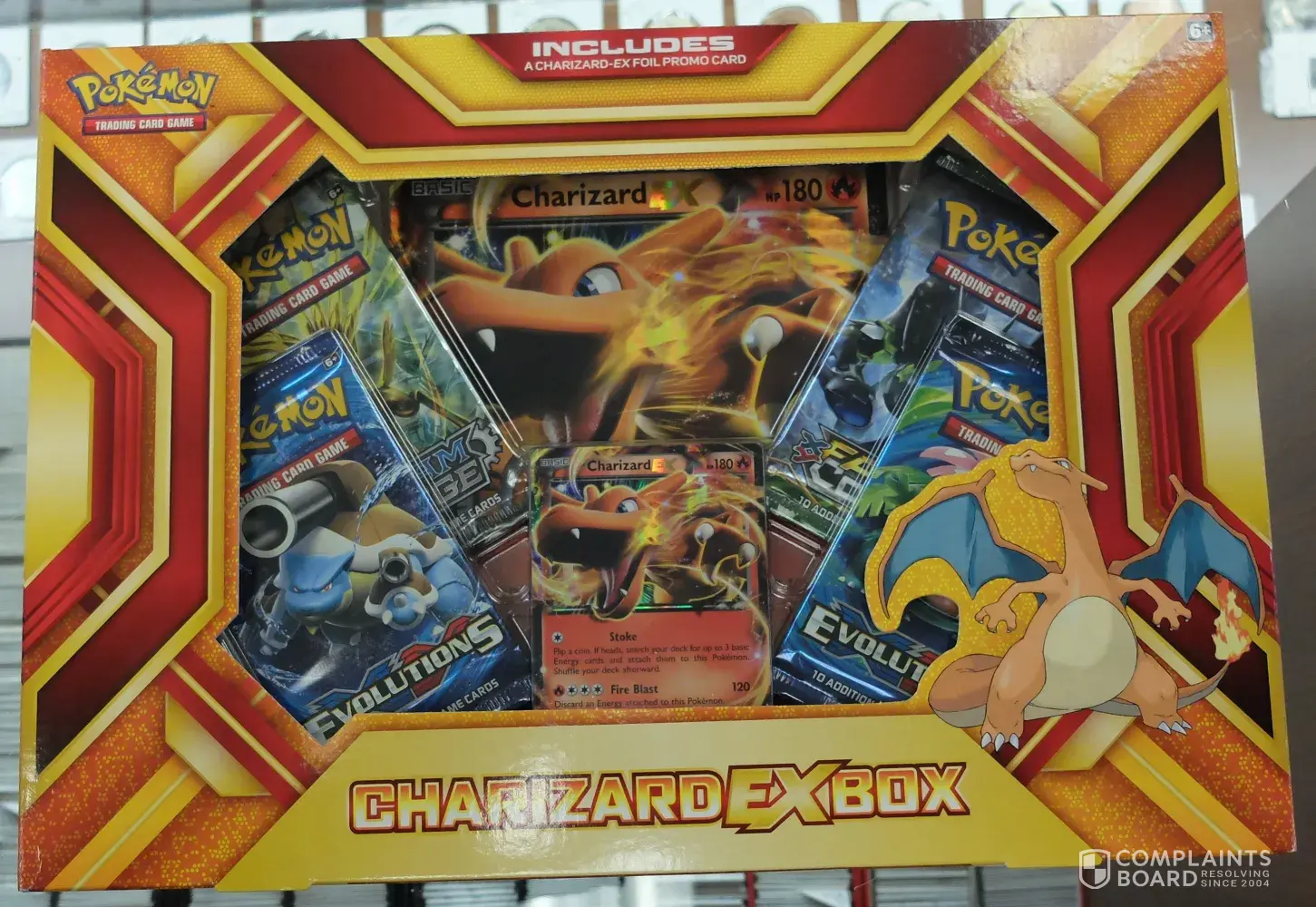 Hi my name is Leigh Bevington owner of South Edmonton Coin & Currency Ltd. at 5712 111 Street NW, Edmonton, Alberta, T6H3G1, Canada. Phone [protected]. We purchase Pokemon cards from our supplier Universal Distribution in Vancouver, Canada and sell in our store. We received a case of 12 sealed Charizard EX boxes on July 4, 2018 from our supplier. After we opened a couple of boxes in my store to sell the Charizard EX cards separetly we noticed that there were factory damaged Pokemon Charizard EX cards in all 12 of the sealed boxes, as per the pictures attached. The sealed cards are bent, almost torn, and have multiple indented scrapes or marks on the back surfaces, but not on the front, again as per the pictures attached. We cannot sell these either individually or as a boxed set as all the Charizard EX special holo card are damaged goods, visible to the eye in the sealed box set itself and even more evident when taken out of the set. We are looking to please have refund, new products sent out to us for resale at our store or whatever else you can think of, please and thank you.