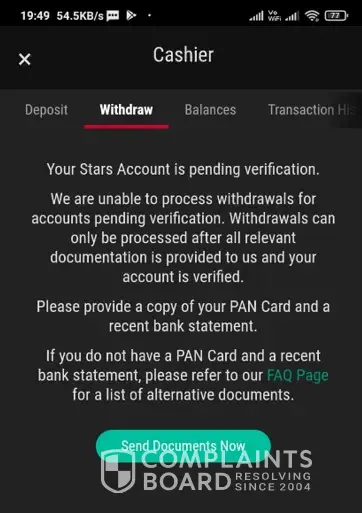 I am Subhajit Mandal, an Indian POKERSTARS user. I installed POKERSTARS mobile application about more than 1 yr ago, I deposited 100 rupees as my first recharge at that time. I had earned a few amount, but at the time of withdrawal they asked for kyc verification, I provided all the documents (pan card, bank statement) but from my android there was only .jpeg (image) format allowed to upload, I never managed my bank account statement as a image(.jpeg) format for uploading, that's why I had uploaded screenshot of my bank statement front page all the time and not surprisingly my account never got verified. That's why I had frustrated enough about them. I never actually tried to reach out their customer care facilities for help and that's why due to extreme anger I lodge this complaint about them JULY 13, 2022 | 10:39 AM EDT and the headline was : "PokerStars.com - Withdrawal is never possible, i am trying since 1 year and more". After lodging the complaint I felt I should contact POKERSTARS customer support once and I found out their email id support@starsaccount.in by web search and discussed my problem in detail, after that all magical things happened to me. Their customer support team is just excellent. They replied in very less time and provided me all the necessary detail for my account verification, they guide me to upload my details through their website so that I can upload .pdf format also. That was very helpful for me, and after that I upload all the details and within half an hour my account got verified and I withdrawn my winning balance to my bank account very easily and quickly. Their customer support team is very fast and awesome. I realised my mistakes and that's why I am writing so lengthy, it's a kind of gratitude or thankfulness to them. I am very glad and now I have no complain about them so I am marking my complaint as resolved. Thank you.