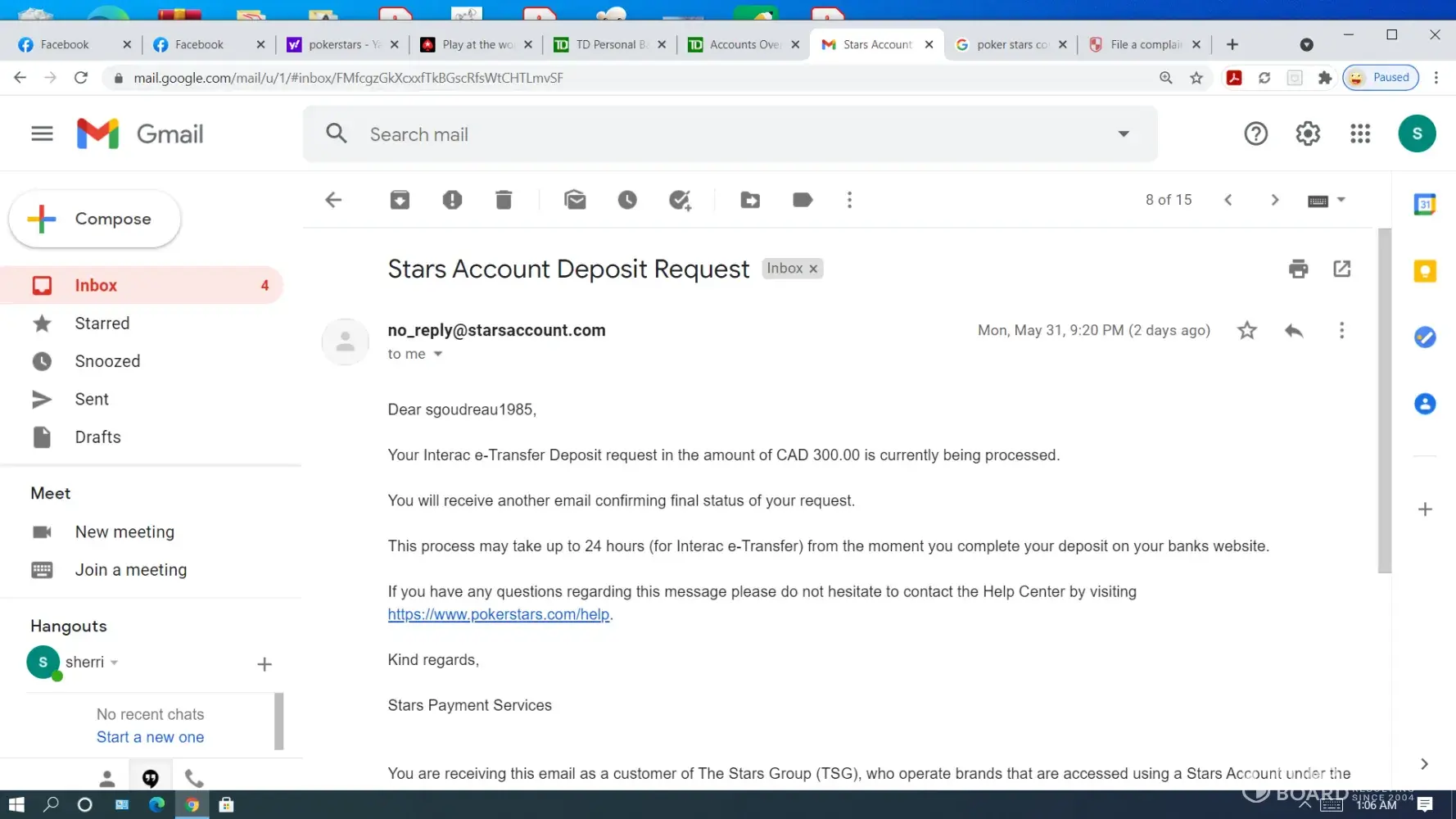 On May 31 I decided to create an account for pokerstars.com, username: sgoudreau1985. After completing the registration I then Deposited $300 Canadian funds via etransfer. Right after the funds showed up into my poker stars account I received an email from pokerstars saying "During a routine review we identified that you have a close relation to the player(s) listed 'cpare__25'". I have replied to them saying I do not know who this person is an this is unprofessional. They then sent me an email saying I can withdrawl the fund once I valadate my account. I replied with an email saying sorry but this is fraud and theft, Pokerstars allowing myself to make a deposit without verifying who I am, then not giving me access to my funds.