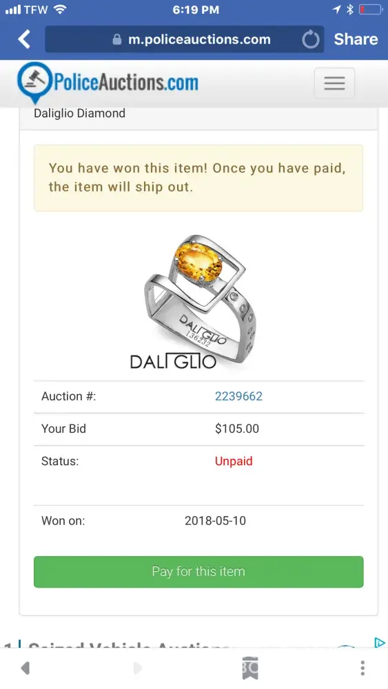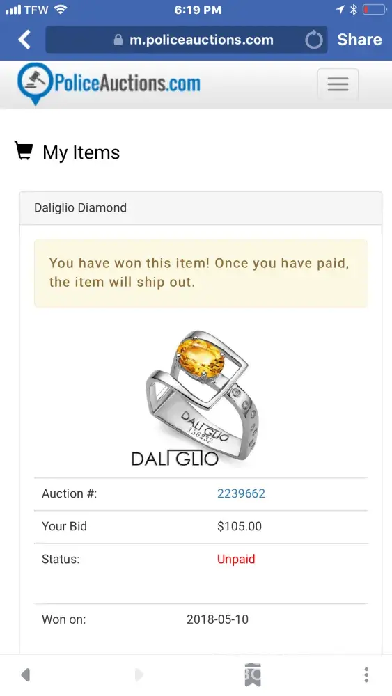 I have purchased some jewelry from this website and received everything but one item was missing and it was the most expensive one. I did not receive the ring which cost me over $800! Items that I did get were nice and I really liked them, but still I'm super disappointed and frustrated. $800 is big money and it's no wonder they did not deliver the most expensive item. According to all the reviews PoliceAuctions is a scam business. Well, I still hope that someday I will get my ring.
