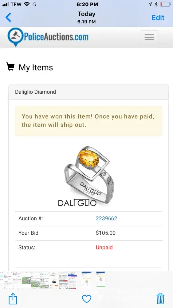 Three days later I got another message stating that I need to pay for my pendant. I contacted customer service and they said that they did not receive the money and asked me to pay if I want to get my item. I told them that I had a confirmation message from them and their rep replied that it was sent to me by a mistake. I even contacted my bank and they confirmed that Police Auctions did receive the money! They are nothing but scammers and they stole from me. This place should be out of business!