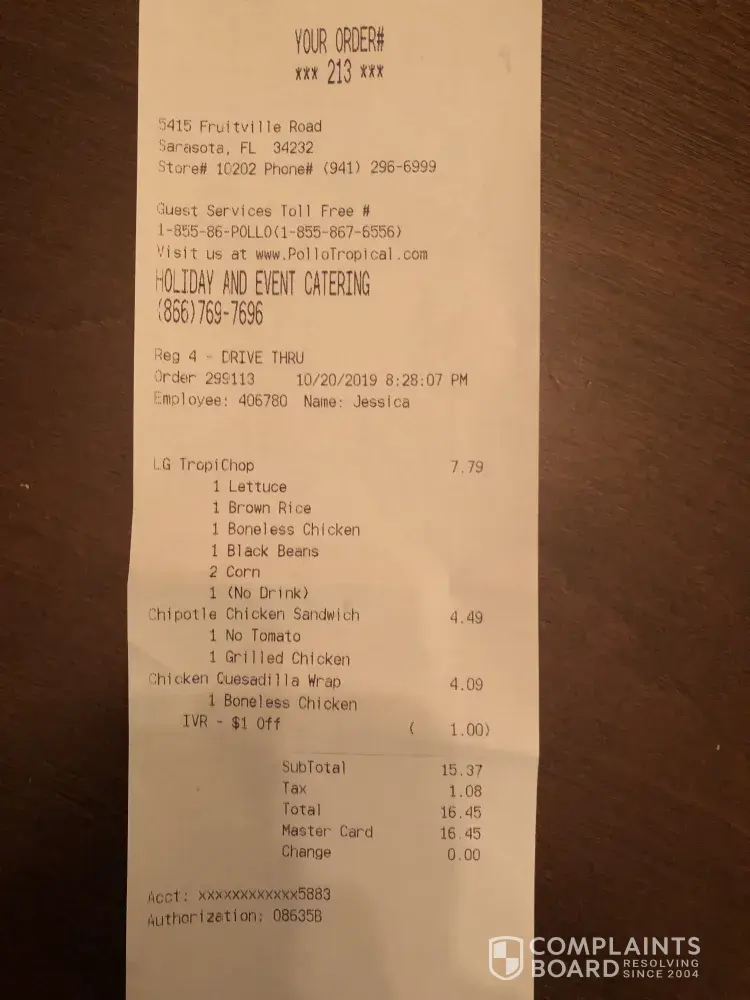 Order a tropichop White rice black beans and boneless chicken and a lemonade on May 5, 2019 at 3:22 PM After 10 minutes of waiting noticed that peoples that came after me getting there orders ask the person at the counter where is the order the Lady at the counter said where is the receipt give her the receipt she says that's not what on the screen she...