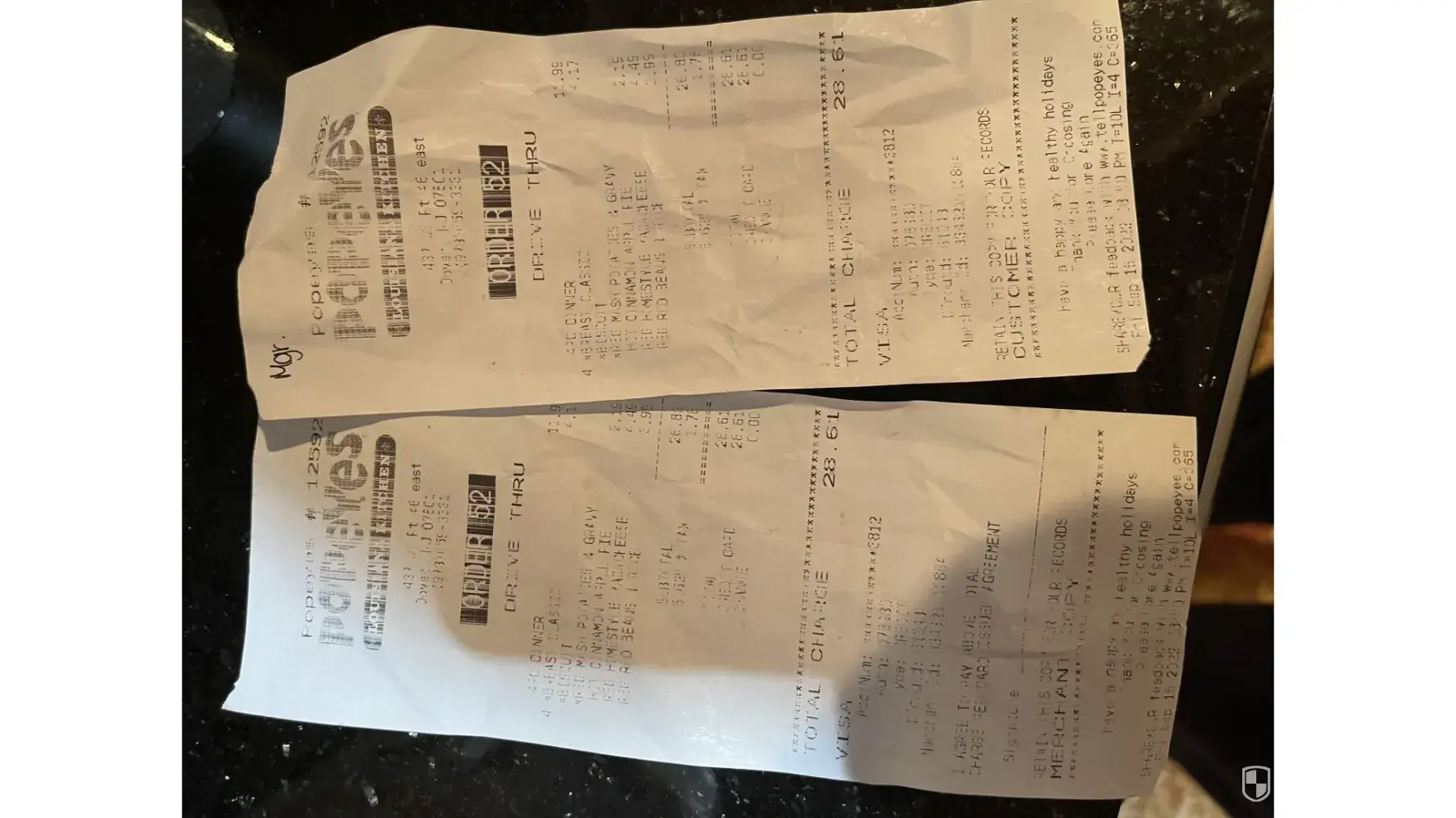 This evening, Wed., Sept. 21,2022, at 8:18 PM, I went to Popeye's #11291 at 5329 Wendy Bagwell Pkwy, Hiram, GA 30141, phone # [protected], and used a coupon for 2 Eat For $9.99, and the RECEIPT says I had ordered 5 classic tenders, 2 biscuits, reg cajun fries, and reg. cole slaw with wild honey sauce and ranch sauce, and paid a total of $10.69, BUT when I got home to share the meal with my spouse, there was some chicken tenders, but NO slaw and ONLY 1 biscuit, and not very many fries. The order was Order 923 — Drive thru, and was paid for with my Visa card... At the bottom of the receipt was a "survey code:" with the info : Wed Sept 21, 2022, 08:18 PM T=10L I=6 C=300. Similar things like this has happened at other times at this location.