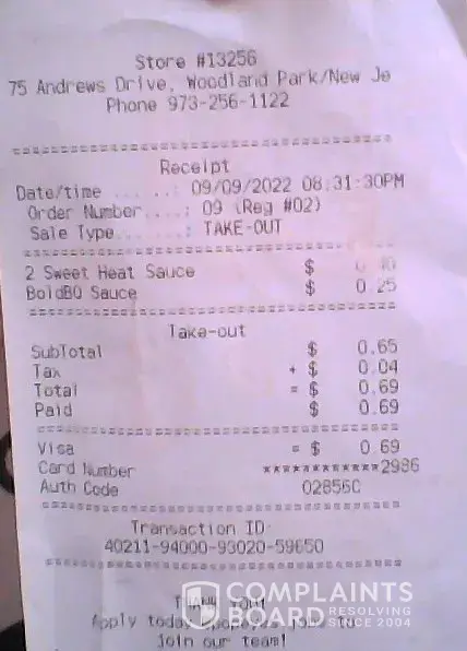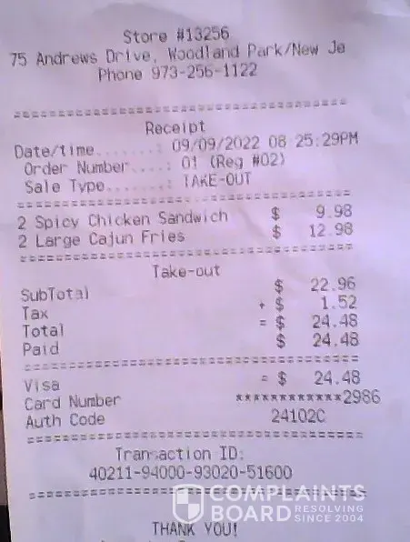 Popeyes of Woodland Park, NJ (store # 13256) charged for 3 sauces when I asked for it along with my purchase of 2 Spicy Chicken Sandwich and 2 Large Cajun fries totaling to $24.48 (incl taxes)