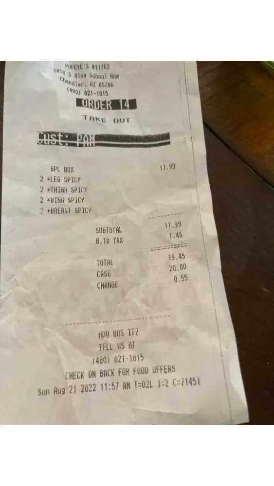 I went to Popyees today located at 2850 S Alma School Road, Chandler, AZ 85286 at 11:57 am (order #14). I order 8 pcs chicken only. My chicken was cold and burnt I looked at my order before leaving and on top of it being cold a burnt it did not contain the correct pieces when ordering 8 pcs chicken only. Per receipt order should have had 2 +leg spicy, 2 +thigh spicy, 2 +wing spicy, 2 +breast spicy this was not what I received, I gave the order back and waited in line. Another customer came behind me and order an 11 piece chicken only for $16.99 that was a special listed on the window of restaurant. After hearing that customer put in his order and manager tried to argue with him he had to tell her to look on the window at the sign. As I continued waiting I decided I wanted to order what the last customer order because I was still waiting, I went back to the counter and set my bag down and stood back in line. When it was my turn again Manager rudely said "take your money you through your food across the counter" I said I did not through anything, several other customer repeated she did not through anything. I took my money and walked out and 2 other customers came behind me and said they did not want their food because she lied, you never through anything and I was very patiently waiting to place another order. She charged me $17.99 for 8 pcs total $19.45 with taxes. THIS MGR DOES NOT KNOW HER COMPANY PRODUCTS SHE IS VERY RUDE AND A THIEF. I will never ever go into that Popeyes again and will discourage anyone and everyone I am in contact with not to patronize that store.