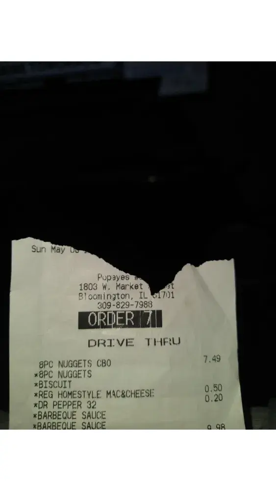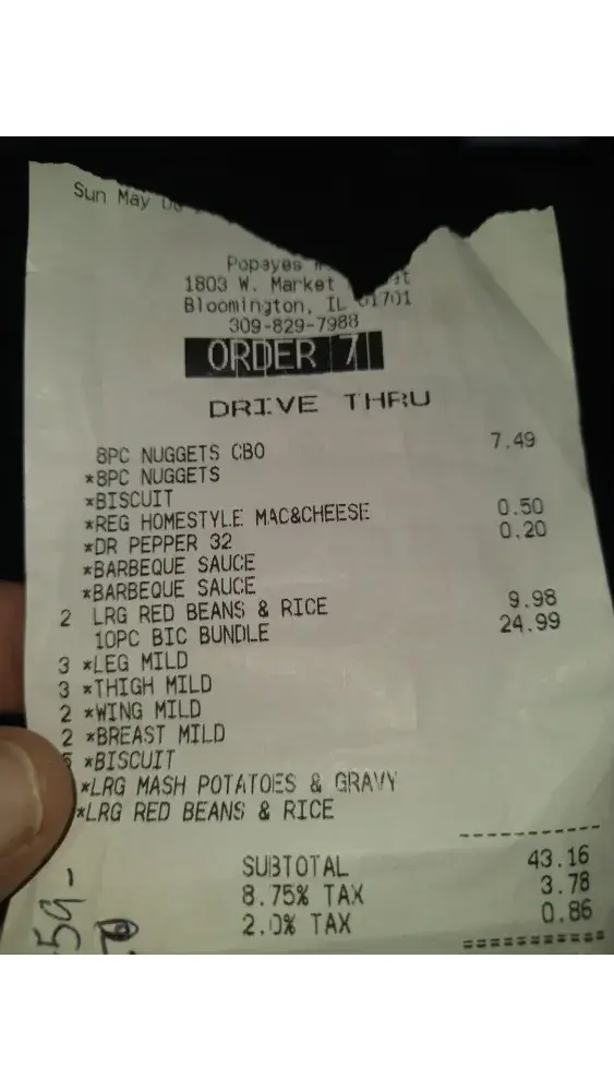 My daughter had to make a trip to Springfield, Illinois yesterday 05/08/2022. Knowing that she was going to be coming back through Bloomington, Illinois on her way home to Ottawa, Illinois and that there was a Popeye's in Bloomington, I gave her my credit card and what to order so she could pick it up on the way home. I wanted a 10 pc. chicken tender meal with red beans and rice and cole slaw. They were out of cole slaw so she got 2 red beans and rice. Also an 8 pc. chx nugget meal w/ fries and a Dr. Pepper. They were out of fries so she got the mac & cheese. Asked for BBQ sauce, which we never received. Through no fault but her own, she did not check the bag and when she got home, I looked and we had a bag of 20 biscuits, nuggets the size of popcorn, mac &ch. 1/2 full and sooo greasy and chicken tenders 1/2 the size they usually are . I tried calling both #'s on the receipt and no answer. Plus I was charged for sides that were supposed to be included in the meal and for mashed potatoes I never ordered. Also if you look on the receipt, I was charged for a 10 pc. regular chicken dinner, not tenders