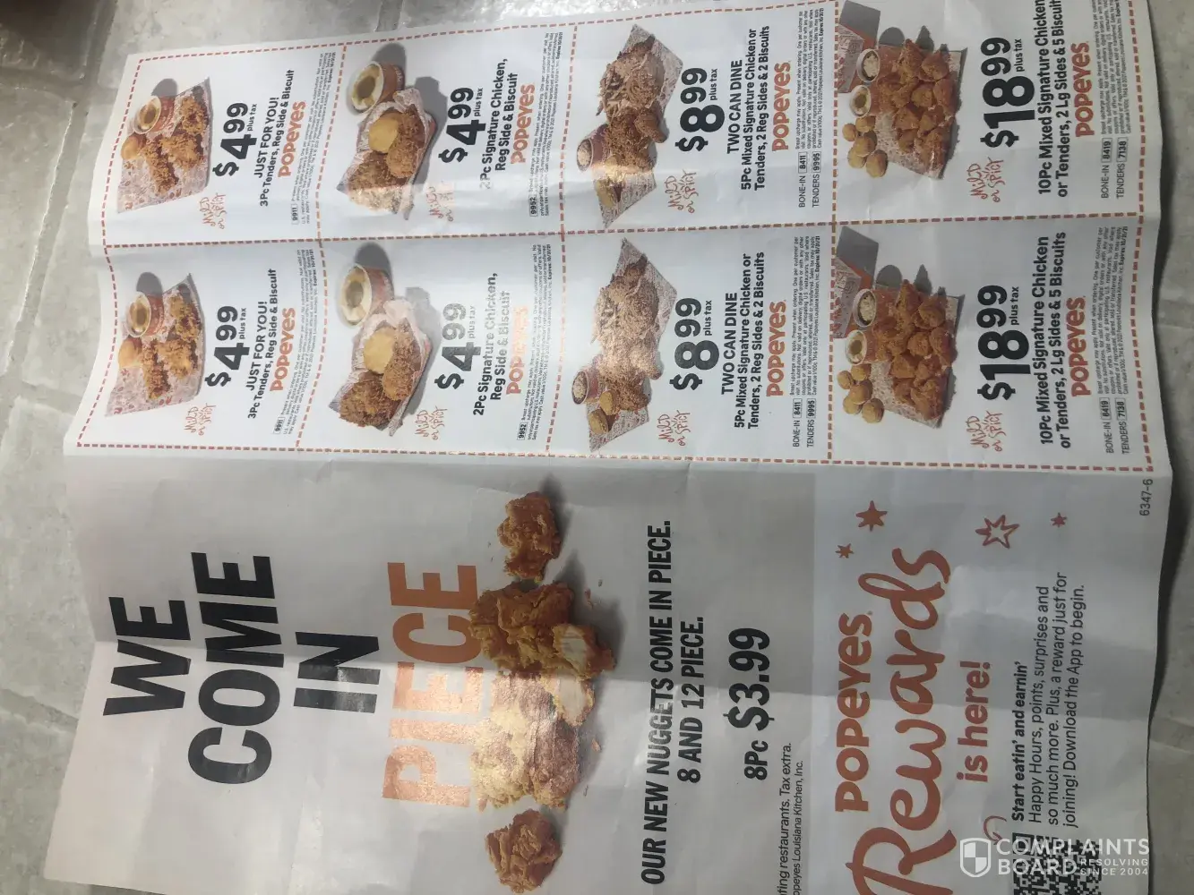 I was at Popeye's chicken on SE 122nd/Division in Portland, OR. It was around 7.30 on 08/29, I ordered a 3 piece combo and when I got home and opened it I got three wings, biscuit, potatoes and drink. For the amount I paid, I believe I should have received something better than 3 wings. Two of the wings were so hard (skin) I could have broken my tooth and...