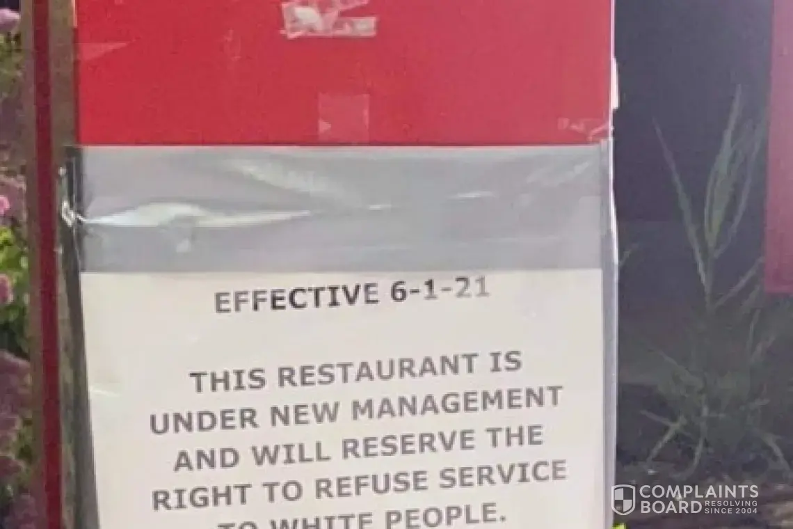 There is this sign that is posted on the drive through window that states: Effective 6-1-21 This restaurant is under new management and will reserve the right to refuse service to white people. We apologize for any inconvenience. Signed, General Manager, Mason Please resolve this issues or have the name Popeye's remove from that building. That is racial...