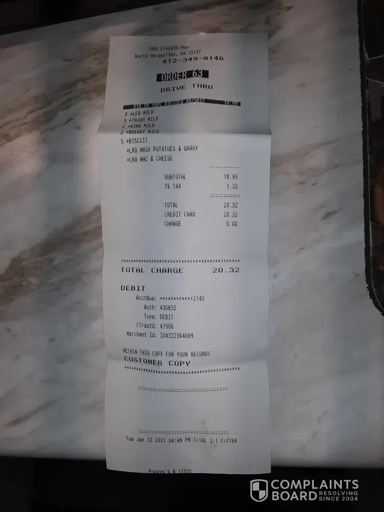 Read full complaint6-2pc, 12 pc missing 3pcs ordering time 8:58 p.m. delivered @ 9:45 Popeyes #13266 order 63 Drive Thru