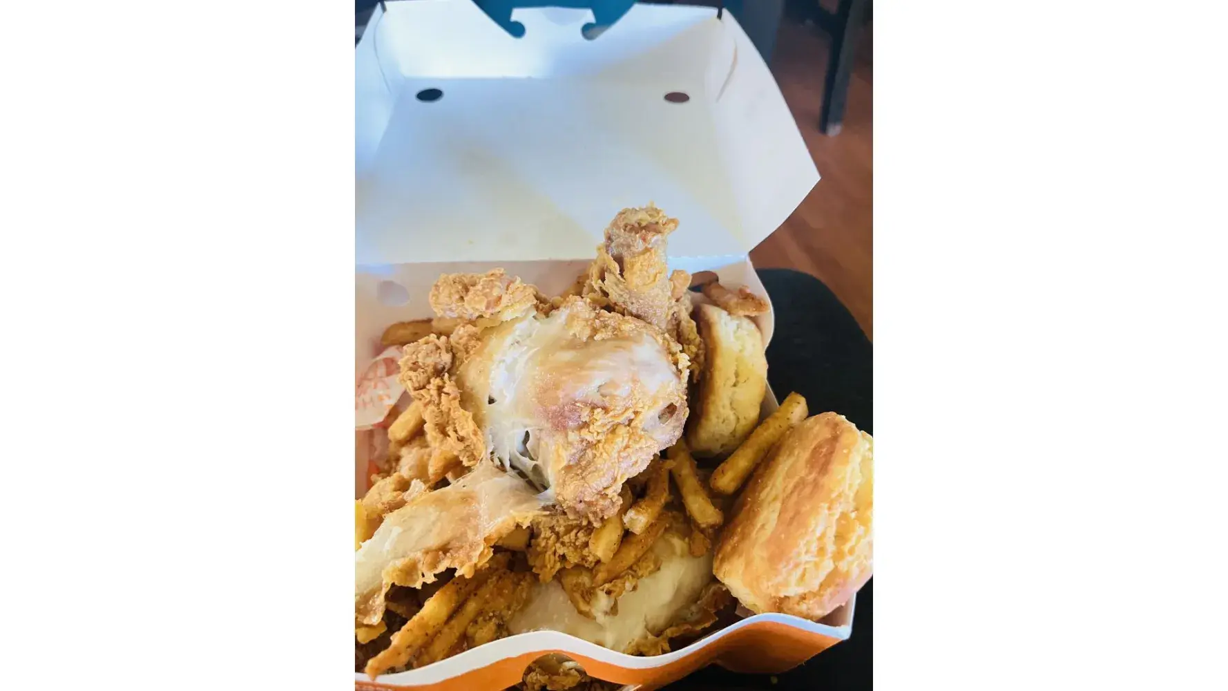 Date 10/24/23 Time 12:27 pm I go here all the time. But this time the meal was awful, the fries were just thrown in a bag, and they were burnt. The chicken was so dry and burnt also, and the Cole slaw was yellow and very warm. Now I'm not a big complainer but seriously looked like the food was under the lights for 3 days. It will be a while before I go...