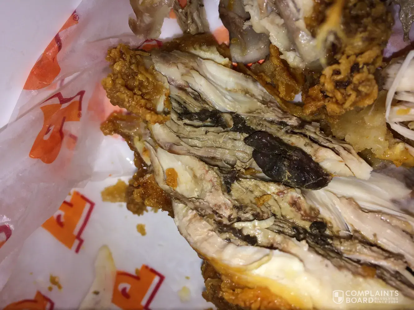 Ordered two piece with onion rings. Asked for ranch and was told it was extra. Agreed to pay extra. Got home and onion rings were soggy and cold. Ranch sauce was not there and neither was receipt when I tried to see if I paid for it. Breast had black matter inside and gray meat. Brought picture back to store and was told I needed a receipt. Tried explaining I never received receipt. Manager said there was nothing she could do without receipt. Even with picture of inedible food. Wrong color to get help in New Orleans Popeyes. Good riddence.