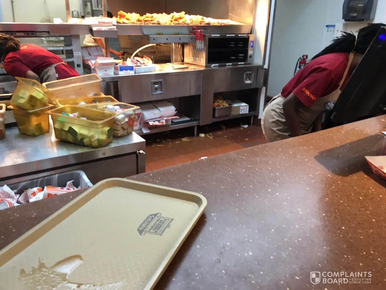We went to the Popeyes franchise on 6224 Greenbelt Road, MD on Tuesday, January 30Someone needs to inspect the Popeyes franchise in Greenbelt, MD immediately. No one was wearing gloves in the entire store, food was on the floor and chicken and fries were actually lying on top of the carry out boxes, the counter was cluttered with customer receipts, there was no tea in the containers, and the staff was nonchalant about all of this.