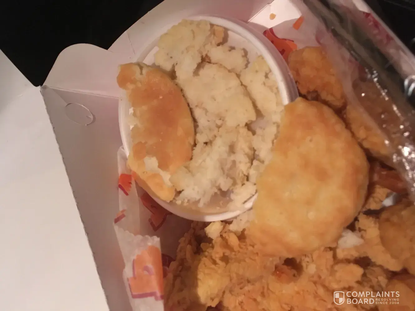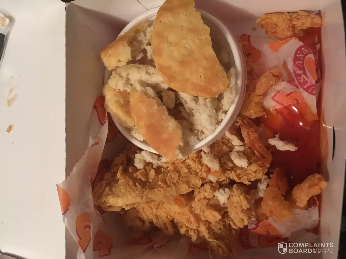 I went to Popeyes and ordered the SurfTurf Shrimp Dinner with potatoes and a biscuit. The biscuit was hard as a brick on top and wet on the bottom. Then I called back to complain and they( the employees) were just yelling that biscuit was not wet and he told me to bring the biscuit back after I had made it home 12 miles . I said no he said well just call the number on the back of my receipt. Every time you go there they will never fully complete your order it's something always missing.