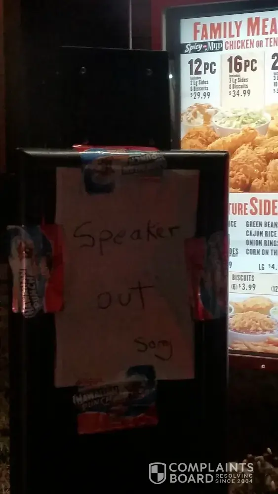 I am writing to make a complaint against the Popeyes drive thru. Every time I show up, there is a very slow line to get through the drive thru. I am currently sitting in line and it has taken me 30 mins to get through 3 cars. Despite the lack of speed and horrible customer service, the speaker box has a taped sign that states "speaker out, sorry". This is beyond unacceptable and needs to be reviewed further. Worst restaurant I have visited in a very long time.