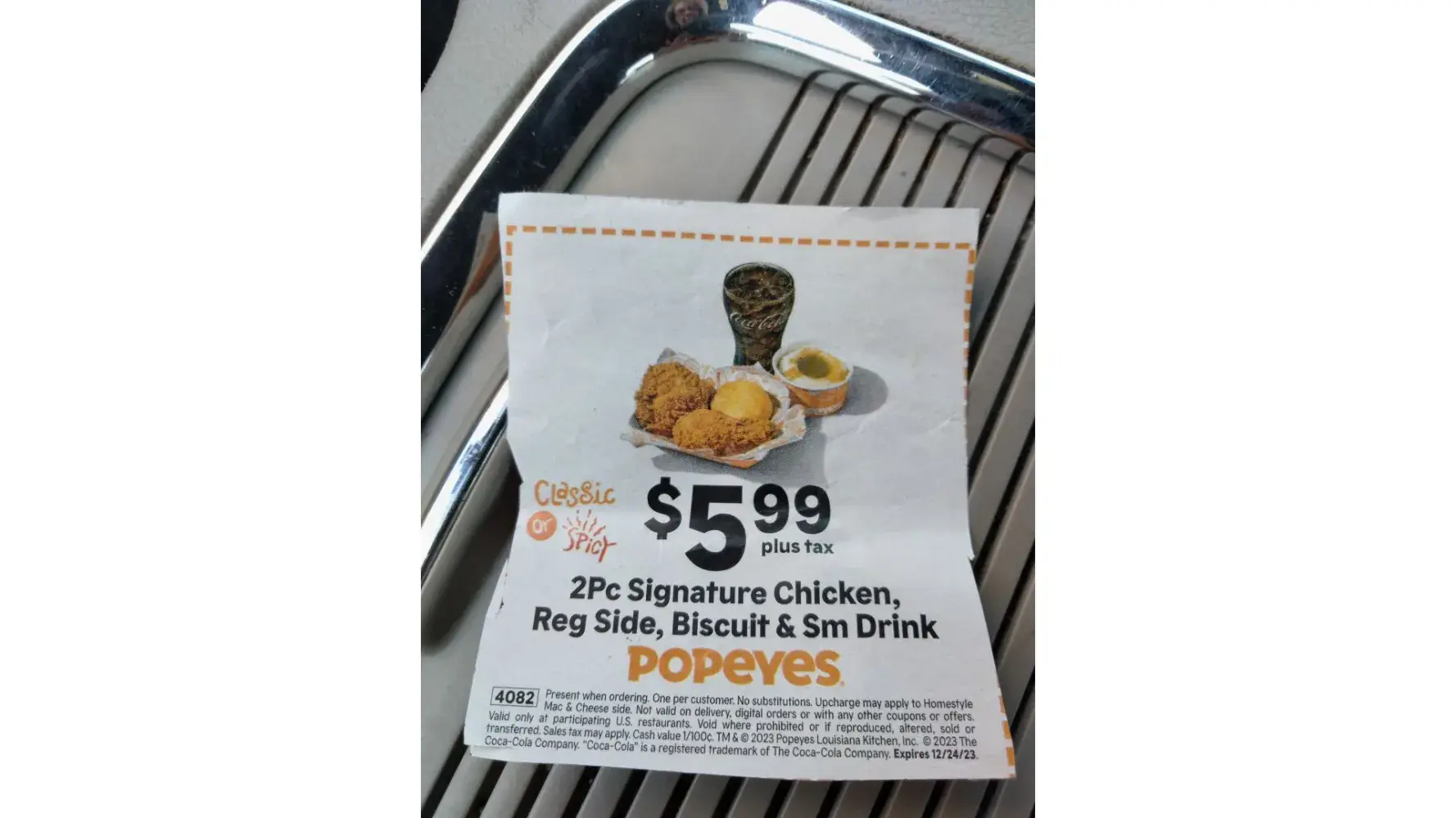 I went in with coupon in hand and the Manager told the cashier No substitutions only what the coupon rings up for. Well it rang up a wing and a leg. My coupon shows a picture and reads 2 Pc signature chicken, reg. side, biscuit & small drink 5.99 plus tax. The picture shows a thigh and a leg. The cashier the took a stack of coupons he had to the side and...